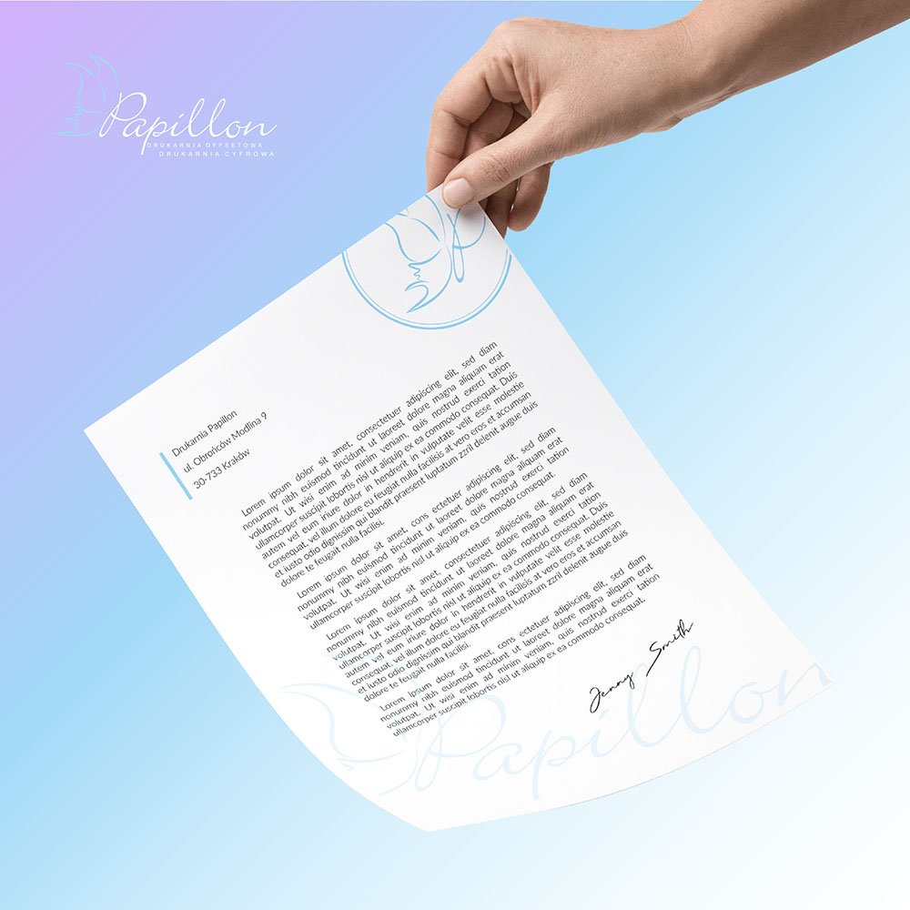 Personalized company letterhead is an elegant way to highlight your brand and build a professional image. Our printing house in Kraków offers printing on standard offset papers with a weight of 80–90 g, or on high-whiteness paper known as Soporset – perfect for official correspondence and marketing activities.