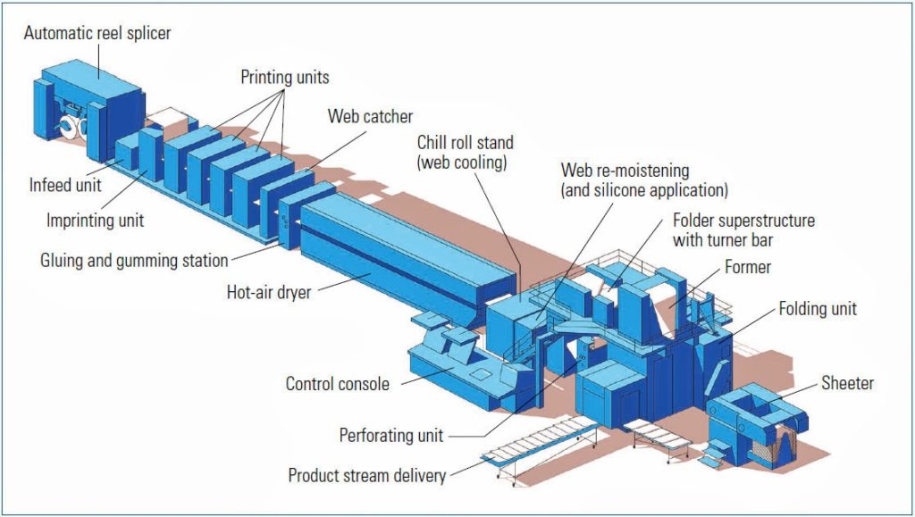 In short, coldset is typically used for high-volume but lower-quality jobs, such as advertising leaflets. Heatset, on the other hand, allows printing on thicker substrates with much higher quality. This technique is often used for high-volume, premium magazines and catalogs. Web presses can operate 3–5 times faster than sheet-fed machines, reducing production costs. Additionally, integrated folding systems can produce nearly finished products directly from the press. Using cheaper roll-stock paper, often calendered or coated, further lowers costs. Overall, the final product is significantly more affordable than in sheet-fed printing.